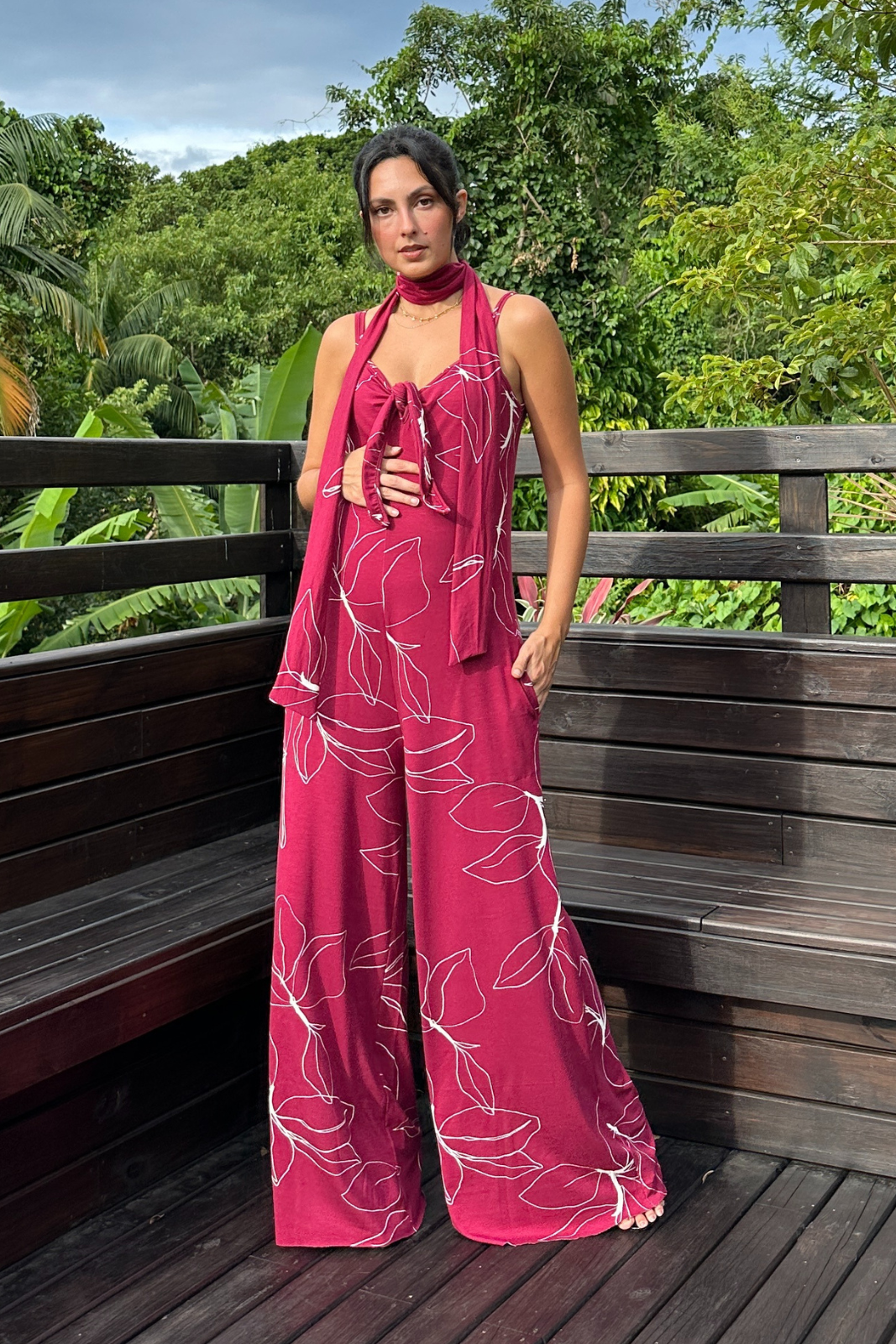 Macacão Gestante Amamentação Estampado Dulce Bossa , une conforto e versatilidade em uma modelagem que acompanha todas as fases da maternidade. Busto duplo e com amarração ajustável e bolsos laterais. Possbilita amamentação facilitada. Acompanha cinto que pode ser amarrado de várias formas. O caimento fluido alonga a silhueta e traz um toque sofisticado para qualquer ocasião.