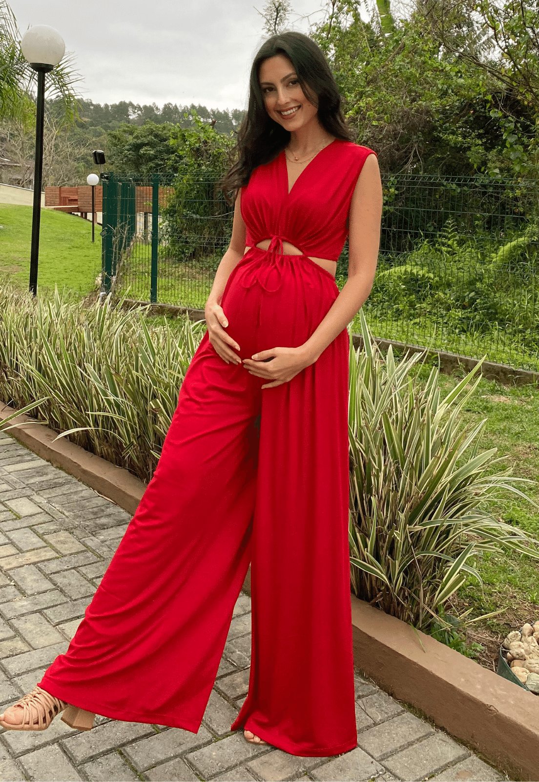 Macacão Gestante pantalona com recortes laterais e abertura nas costas. Possibilita ajuste da abertura frontal com a cordinha para o tamanho da sua preferência.